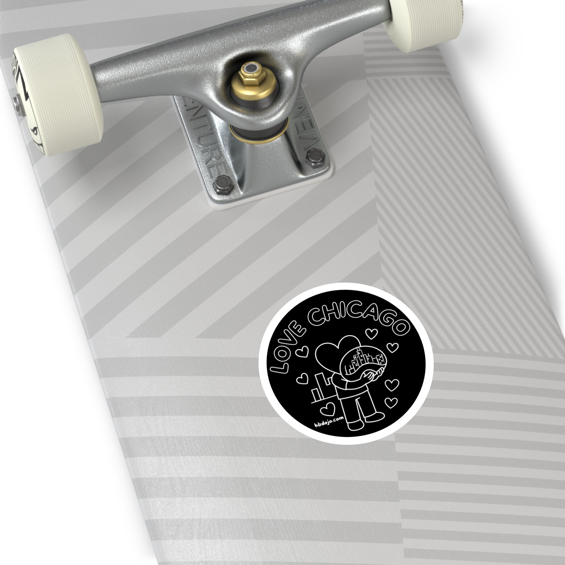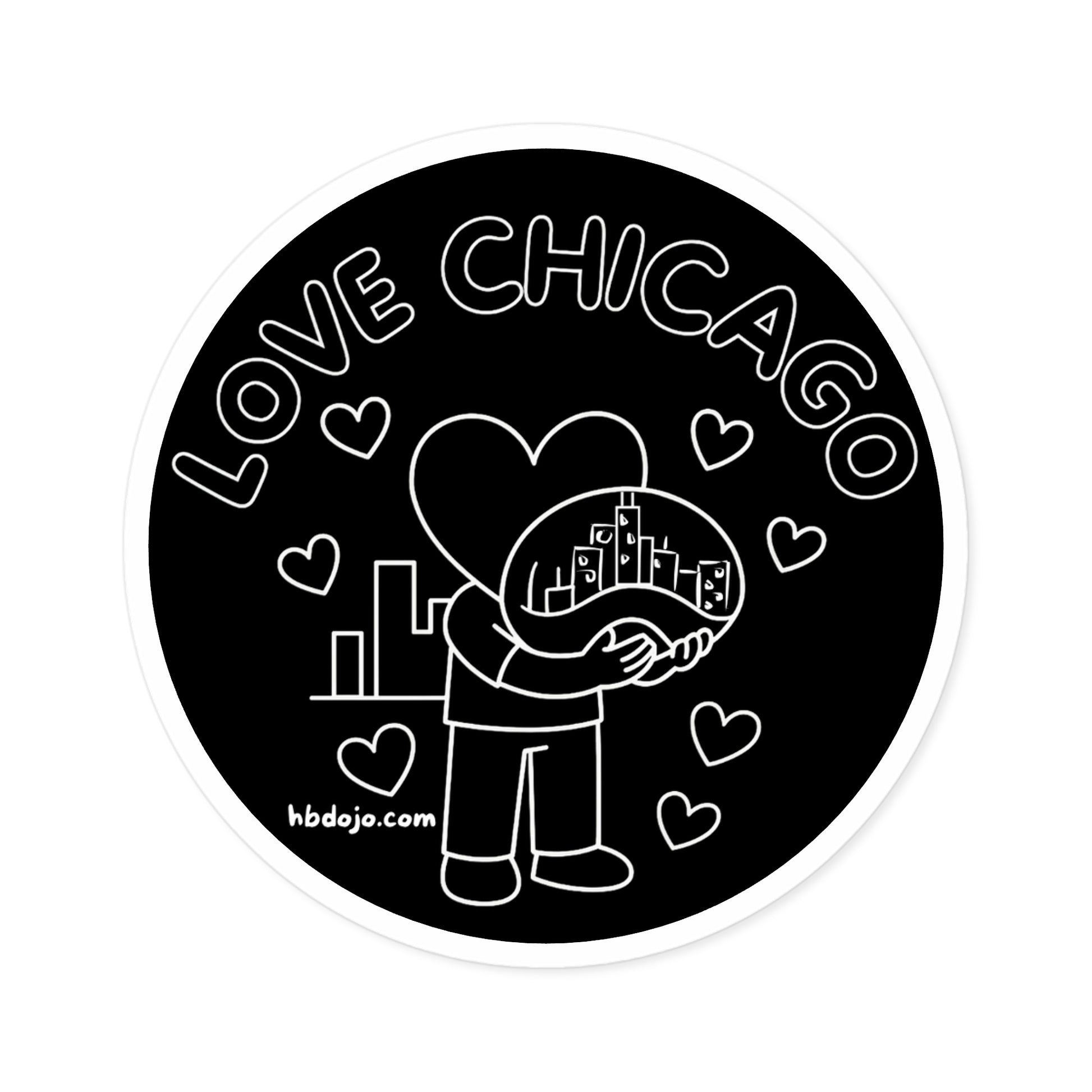 Carry a little Chicago with you — a quiet, heartfelt emblem for people who feel tied to the city. This round vinyl sticker shows Hearthead cradling "the bean", surrounded by tiny hearts and the words “LOVE CHICAGO.” Matte-black background and crisp white linework give it a modern, doodle-like charm that stands out on laptops, water bottles, journals, and phone cases. Weather-resistant and laminated, it keeps its bold contrast through commutes, coffee runs, and rainy days. Stick it on the things you take everywhere to remind yourself (and others) of the places that matter.